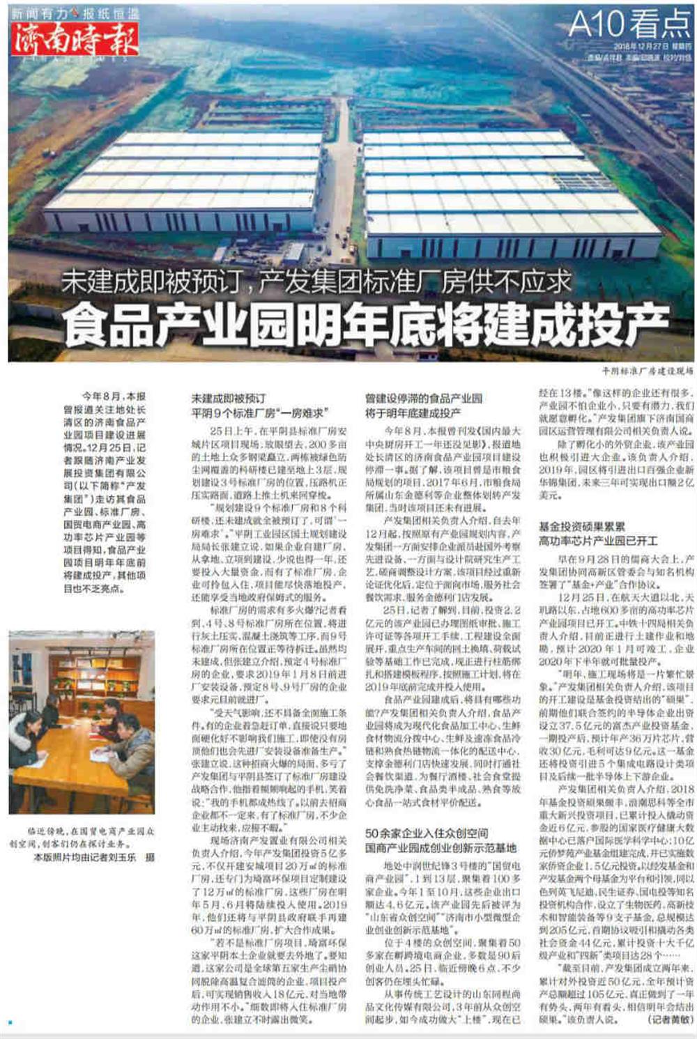 今年8月,本報曾刊發(fā)《國內最大中央廚房開工一年還沒見影》,報道地處長清區(qū)的濟南食品產業(yè)園項目建設停滯一事。12月25日,記者跟隨濟南產業(yè)發(fā)展投資集團有限公司(以下簡稱“產發(fā)集團”)走訪其食品產業(yè)園、標準廠房、國貿電商產業(yè)園、高功率芯片產業(yè)園等項目,得知食品產業(yè)園項目明年年底前將建成投產,其他項目也不乏亮點。